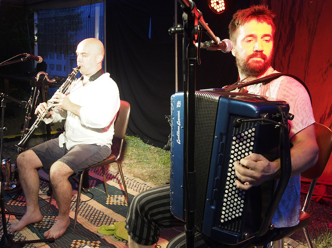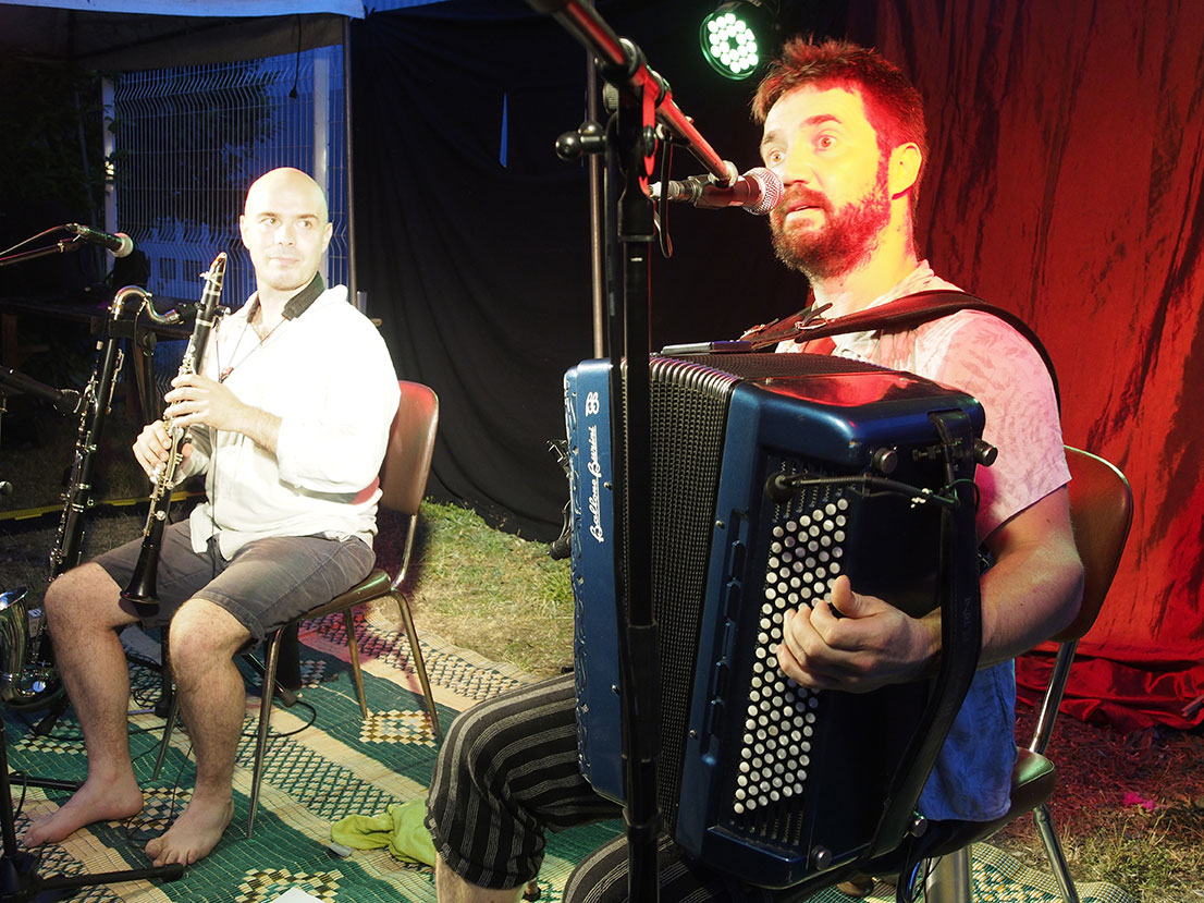 Hier soir, le café associatif de mon village organisait une grande fête. Les petits ont eu droit à une super boumbia (contraction de boum+cumbia) pleine de bulles. Puis Quidam Trio est venu en duo, et enfin Grondes, un batteur multi-talents (mais je n’ai pas de photos de lui, malheureusement, car j’étais occupée à boire des coups avec mes amis et je n’ai pas vu le concert passer ! sorry !).